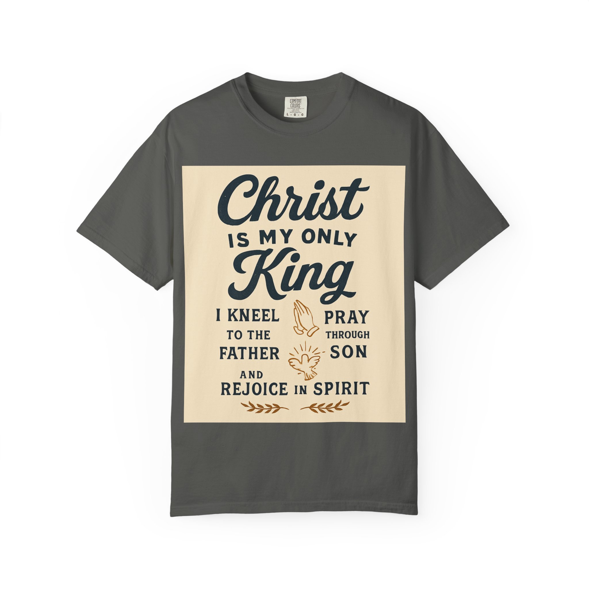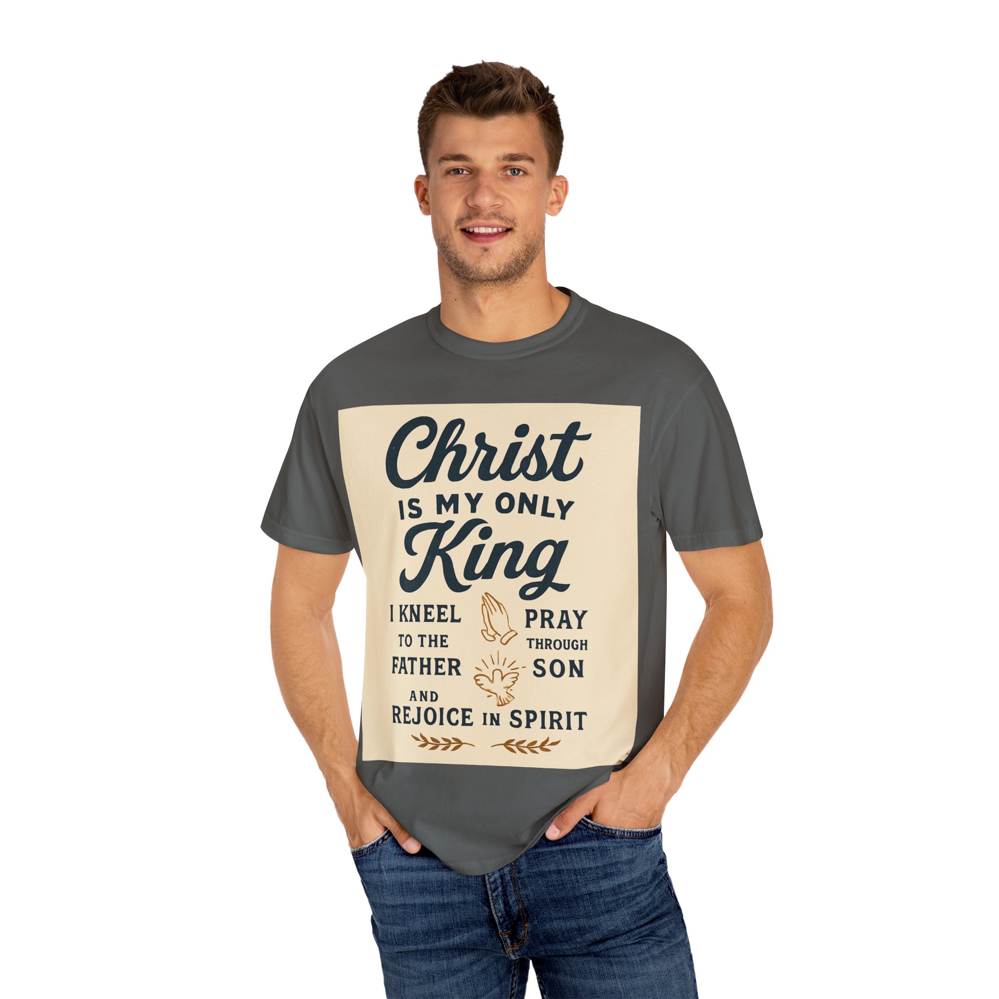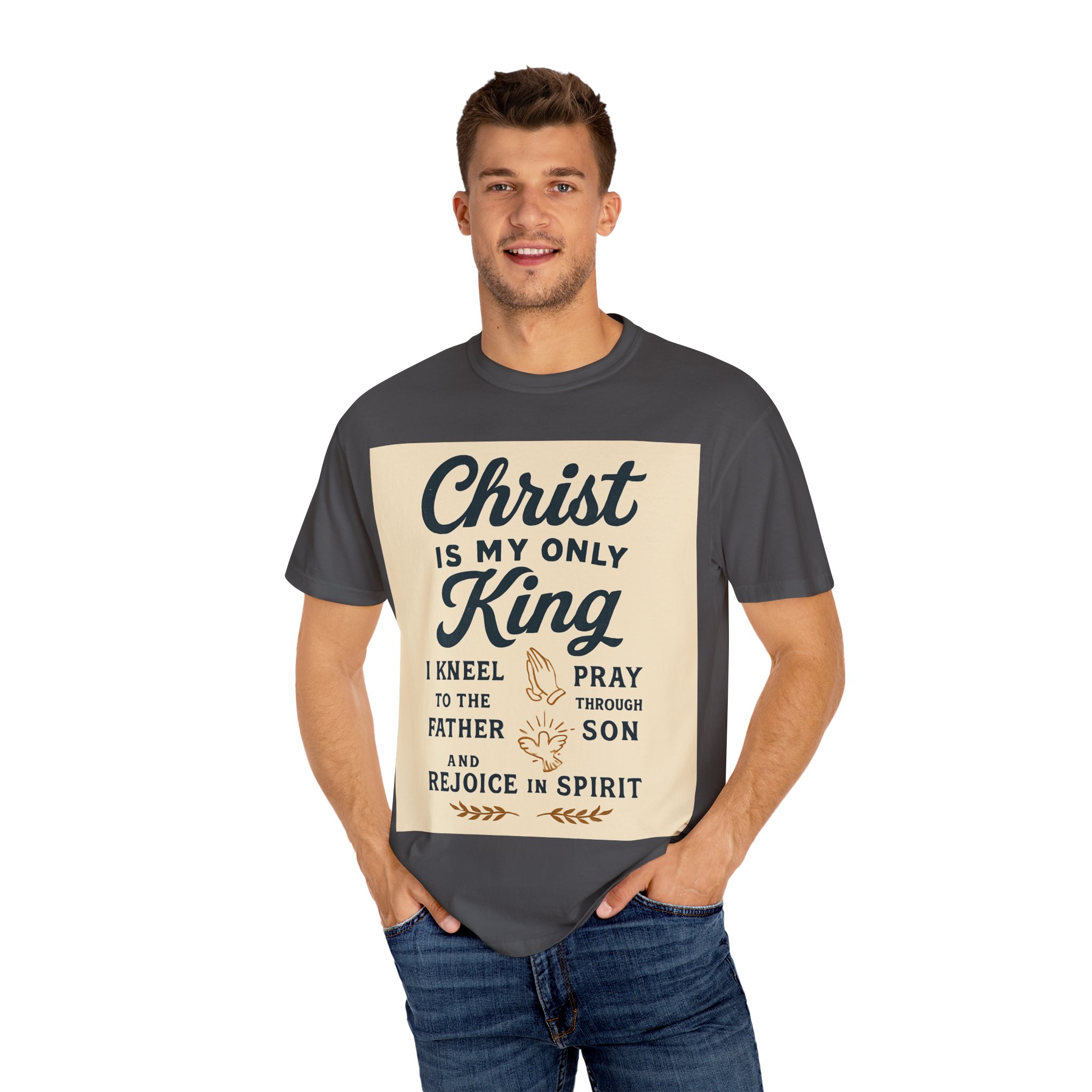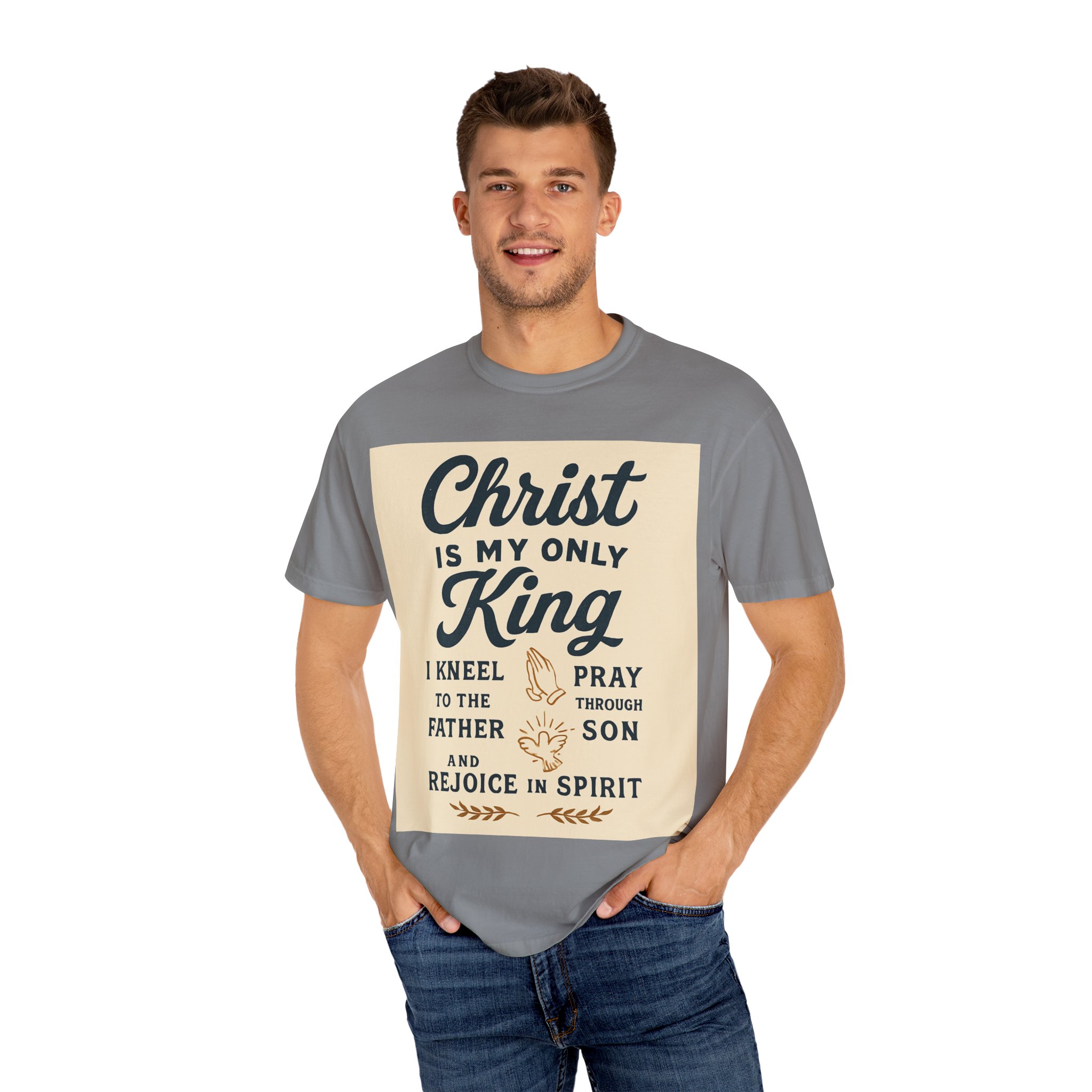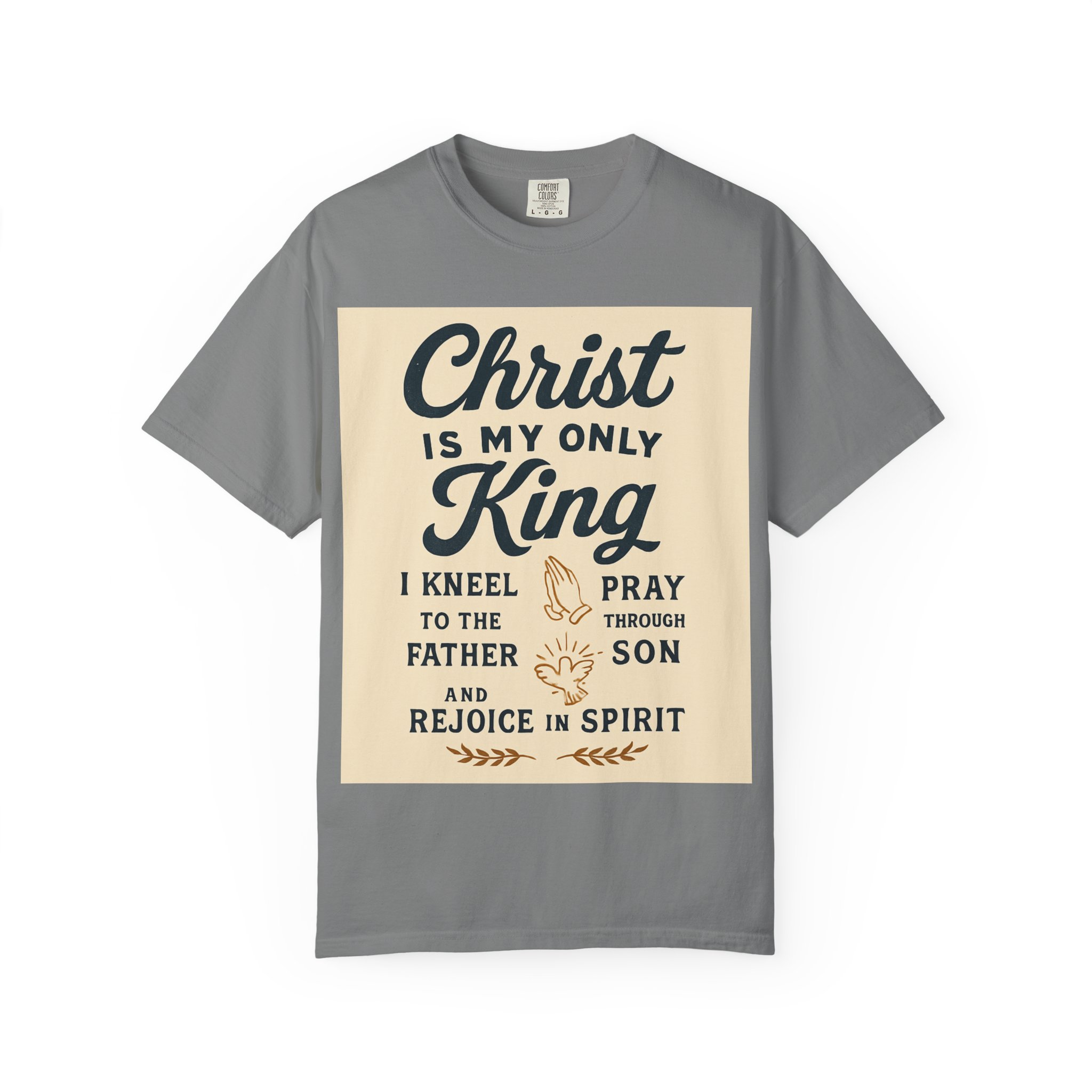 Soft, garment-dyed cotton meets a heartfelt message. This relaxed-fit tee carries a vintage-inspired devotional print that reads like a personal reminder: ‘‘Christ is my only King’’ with thoughtful lines about kneeling, praying, and rejoicing in spirit. The print’s warm, muted palette sits on a soft, lived-in fabric that feels broken-in from day one. Wear it to church, small-group gatherings, volunteer days, or quiet mornings at home — it’s meant to be part of your everyday rhythm, not a statement you have to fuss over. The comfortable cut layers easily under jackets or over long sleeves and holds its shape with double-needle stitching and a tubular knit that keeps seams clean and simple.