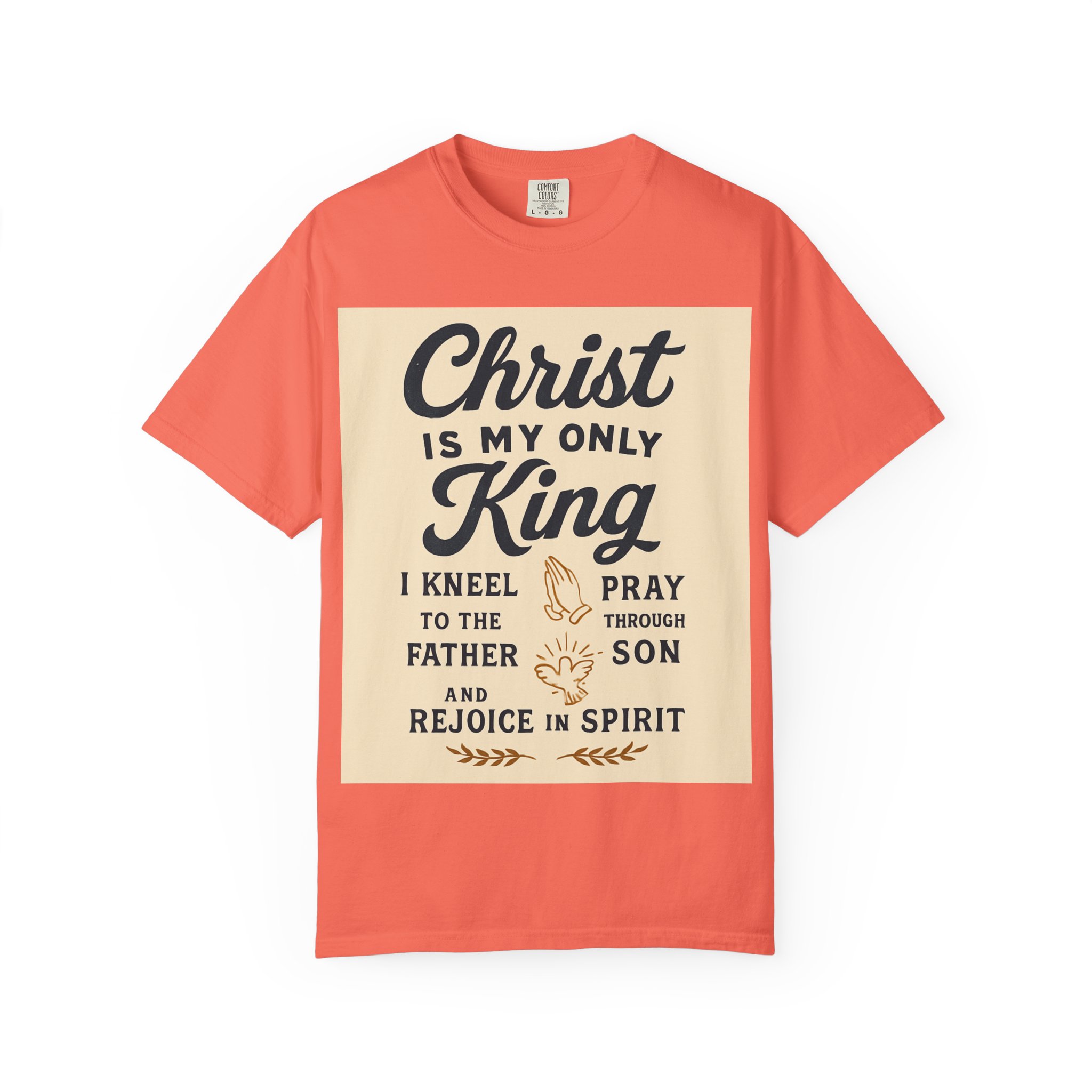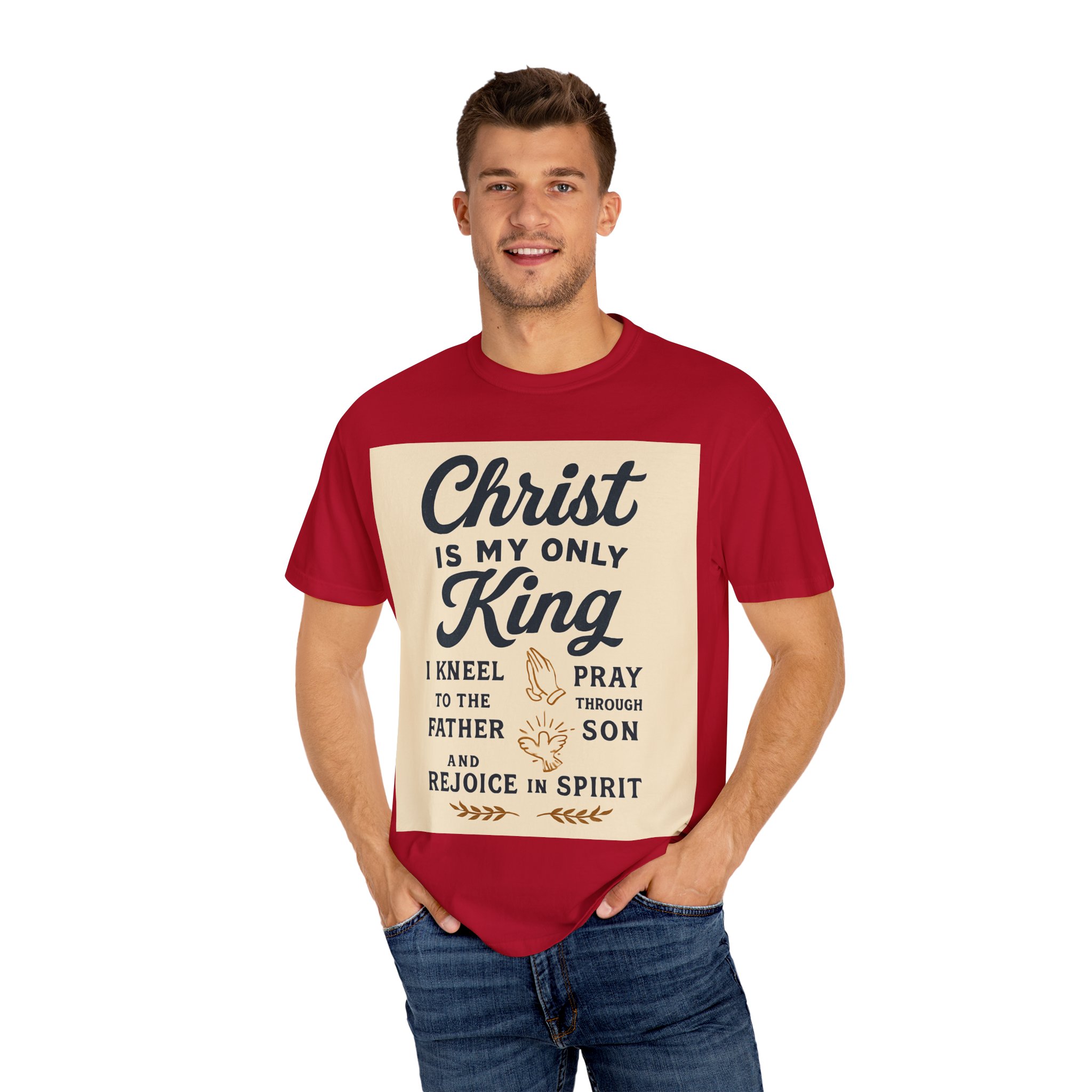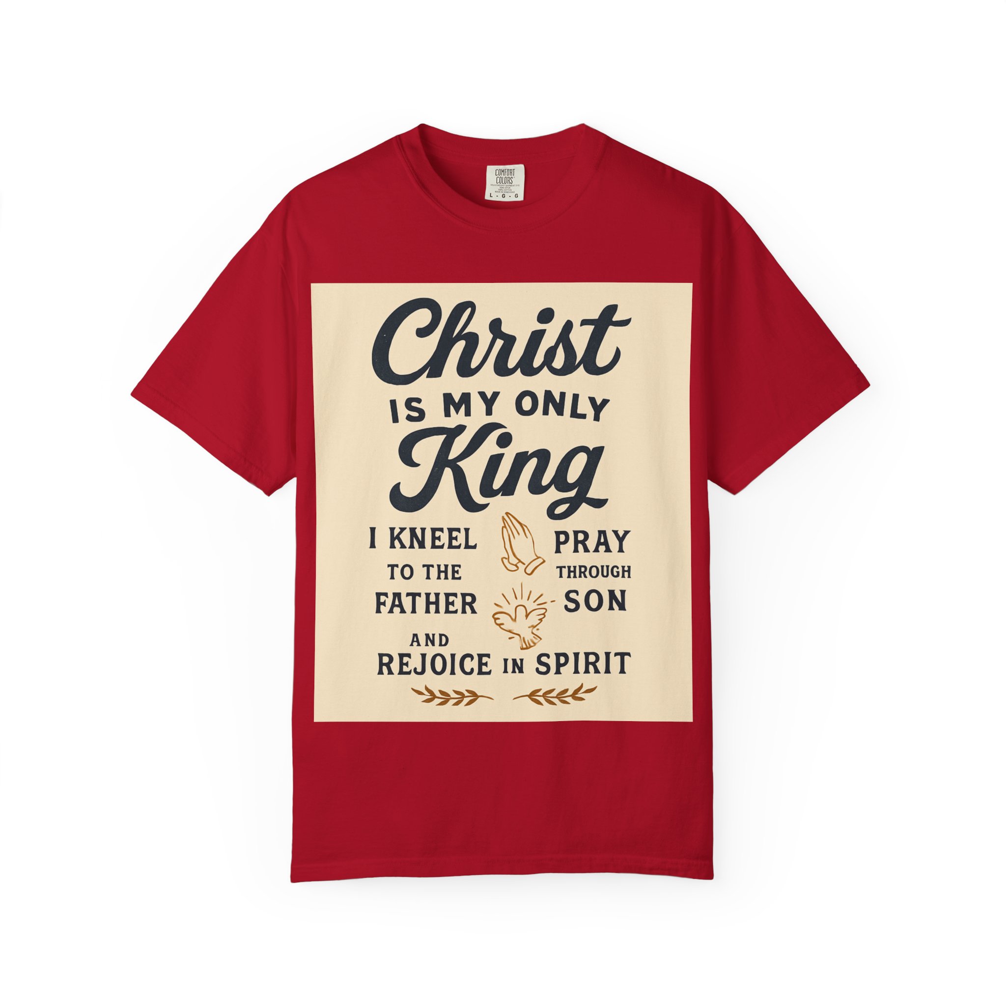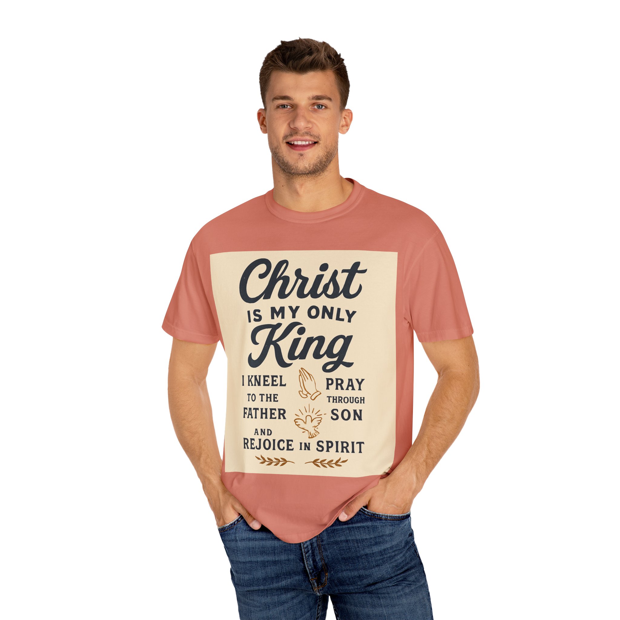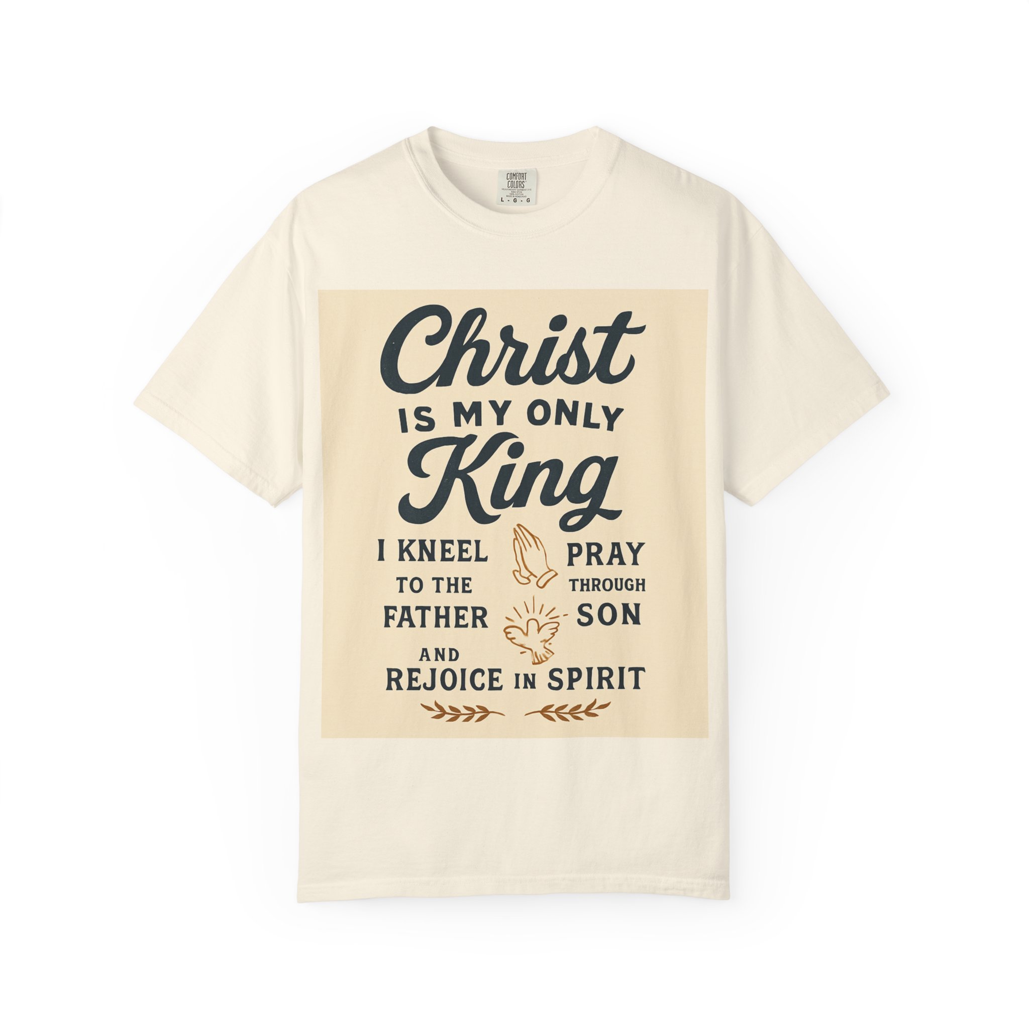 Soft, garment-dyed cotton meets a heartfelt message. This relaxed-fit tee carries a vintage-inspired devotional print that reads like a personal reminder: ‘‘Christ is my only King’’ with thoughtful lines about kneeling, praying, and rejoicing in spirit. The print’s warm, muted palette sits on a soft, lived-in fabric that feels broken-in from day one. Wear it to church, small-group gatherings, volunteer days, or quiet mornings at home — it’s meant to be part of your everyday rhythm, not a statement you have to fuss over. The comfortable cut layers easily under jackets or over long sleeves and holds its shape with double-needle stitching and a tubular knit that keeps seams clean and simple.