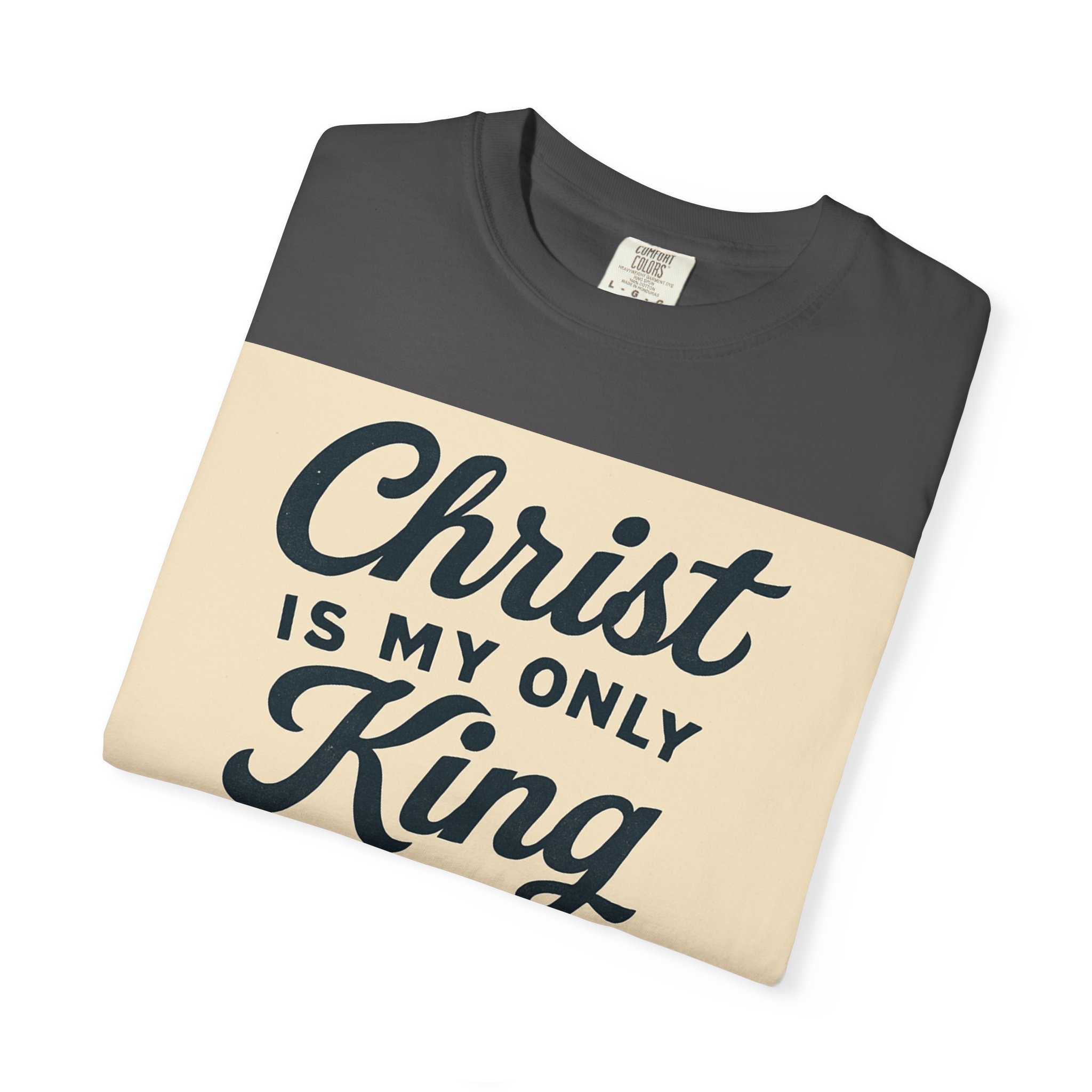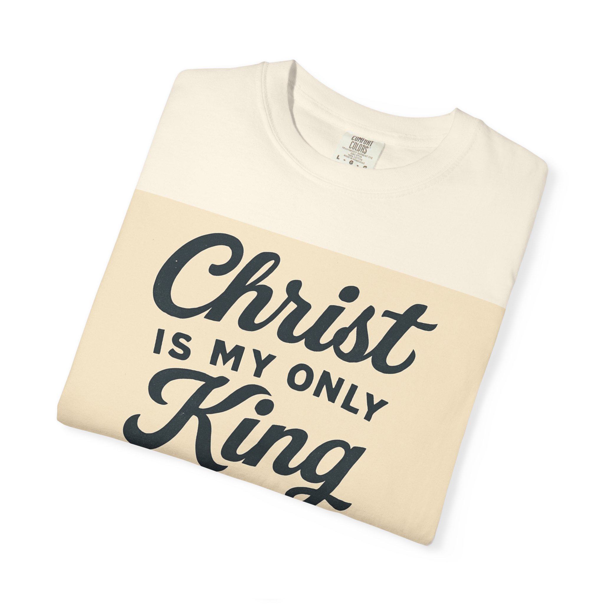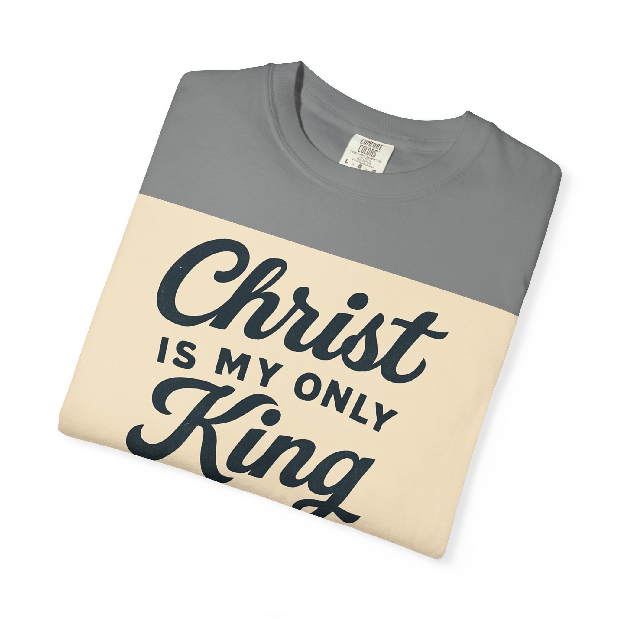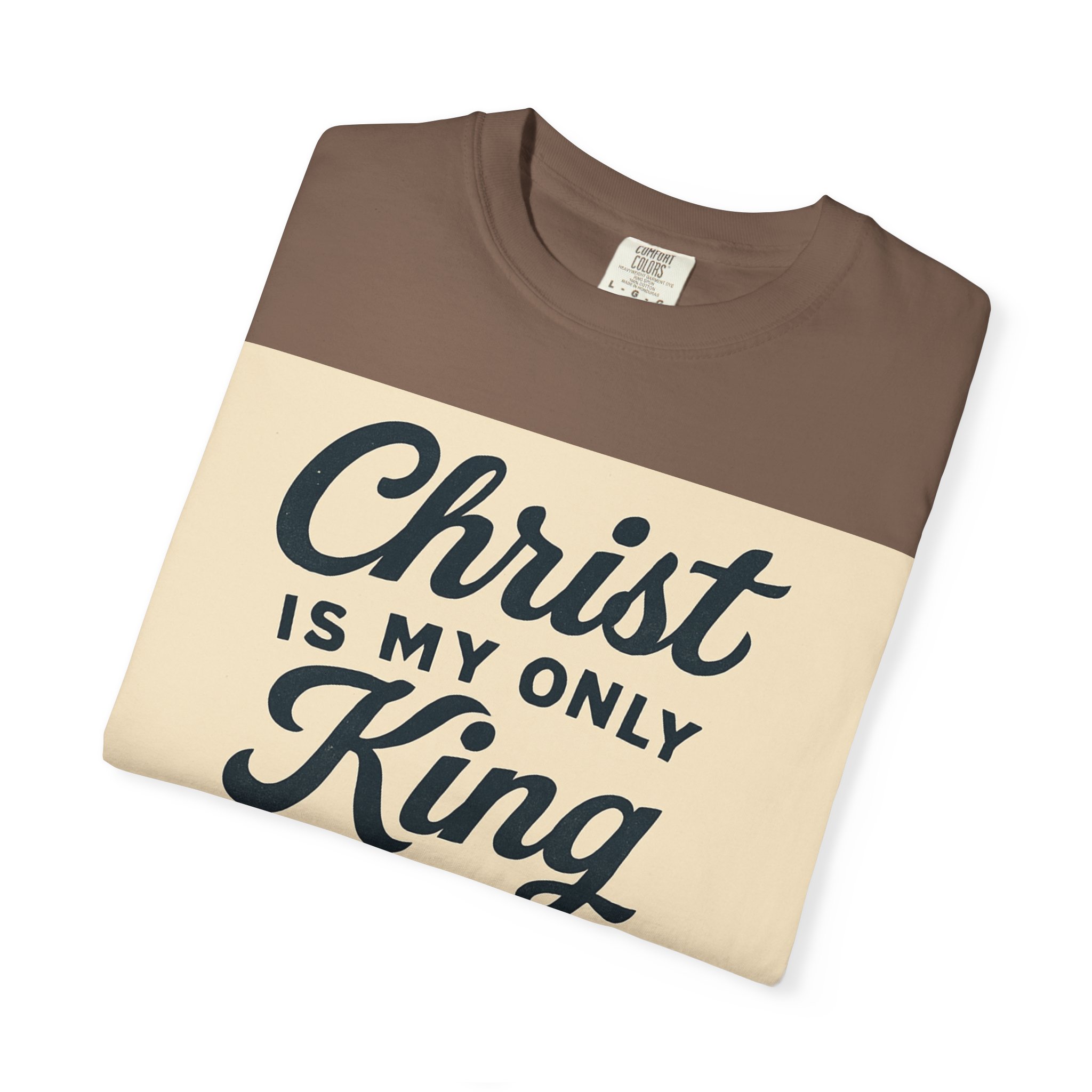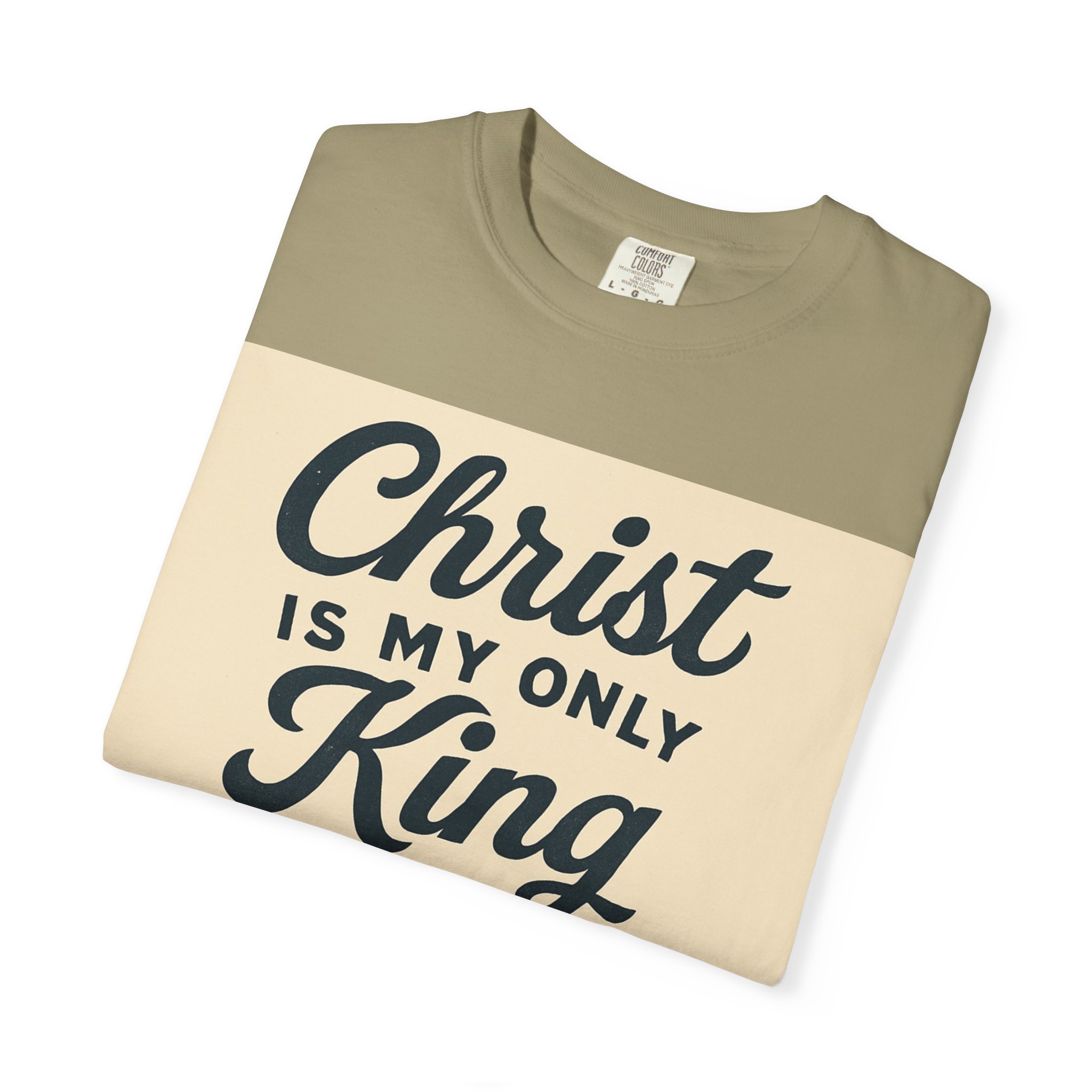 Soft, garment-dyed cotton meets a heartfelt message. This relaxed-fit tee carries a vintage-inspired devotional print that reads like a personal reminder: ‘‘Christ is my only King’’ with thoughtful lines about kneeling, praying, and rejoicing in spirit. The print’s warm, muted palette sits on a soft, lived-in fabric that feels broken-in from day one. Wear it to church, small-group gatherings, volunteer days, or quiet mornings at home — it’s meant to be part of your everyday rhythm, not a statement you have to fuss over. The comfortable cut layers easily under jackets or over long sleeves and holds its shape with double-needle stitching and a tubular knit that keeps seams clean and simple.